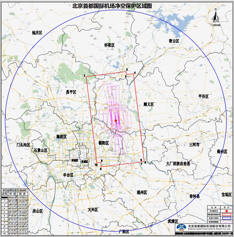 首都機場凈空重點保護區(qū)域(凈空巡視檢查區(qū)域)范圍為首都機場跑道中心線兩側(cè)各10公里、跑道端外各20公里以內(nèi)的區(qū)域,涉及順義區(qū)、朝陽區(qū)、通州區(qū)、昌平區(qū)及懷柔區(qū)部分區(qū)域,總面積約1050平方公里。