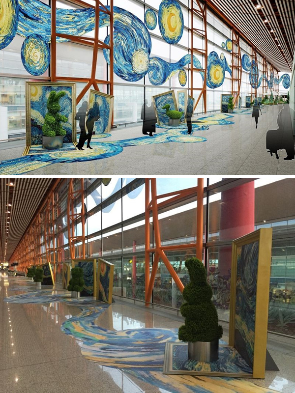 星空長(zhǎng)廊以星空為主題,玻璃幕墻上有高為5.2米的星月夜圖案,沿途地面鋪設(shè)星月夜地貼,設(shè)置了六處動(dòng)物造型綠植,有兔子、小熊、大象、麋鹿等動(dòng)物造型,共計(jì)70米長(zhǎng)。