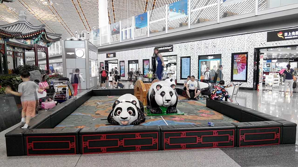 E21登機口的兒童活動區(qū)以中國國寶熊貓為主題建造。樂園內(nèi)憨態(tài)可掬的大熊貓或臥或躺形態(tài)各異,綠色圍墻紅色欄桿與旁邊的中式古建筑相應成趣。