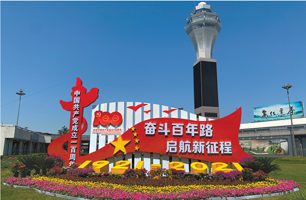 在亮相T2樓前的《奮斗百年路啟航新征程》主題景觀中,五顏六色的鮮花與郁郁蔥蔥的草坪交相輝映,紅旗高高飄揚(yáng),熠熠生輝,象征建黨百年的偉大成就以及紅色革命精神的傳承,生動展現(xiàn)了中國共產(chǎn)黨團(tuán)結(jié)帶領(lǐng)中國人民不忘初心、牢記使命、艱苦奮斗的百年光輝歷程。