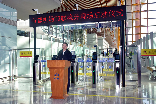 1月14日下午,首都機(jī)場(chǎng)舉行T3聯(lián)檢分現(xiàn)場(chǎng)啟動(dòng)儀式。首都機(jī)場(chǎng)集團(tuán)公司黨委委員、首都機(jī)場(chǎng)股份公司黨委書記張國(guó)良,首都機(jī)場(chǎng)股份公司副總經(jīng)理杜強(qiáng),北京出入境邊防檢查總站副總站長(zhǎng)吉利霞,首都機(jī)場(chǎng)海關(guān)副關(guān)長(zhǎng)段凱,中國(guó)國(guó)際航空股份有限公司總會(huì)計(jì)師肖烽,北京首都機(jī)場(chǎng)航空安保公司總經(jīng)理李萬(wàn)明等領(lǐng)導(dǎo)出席啟動(dòng)儀式。